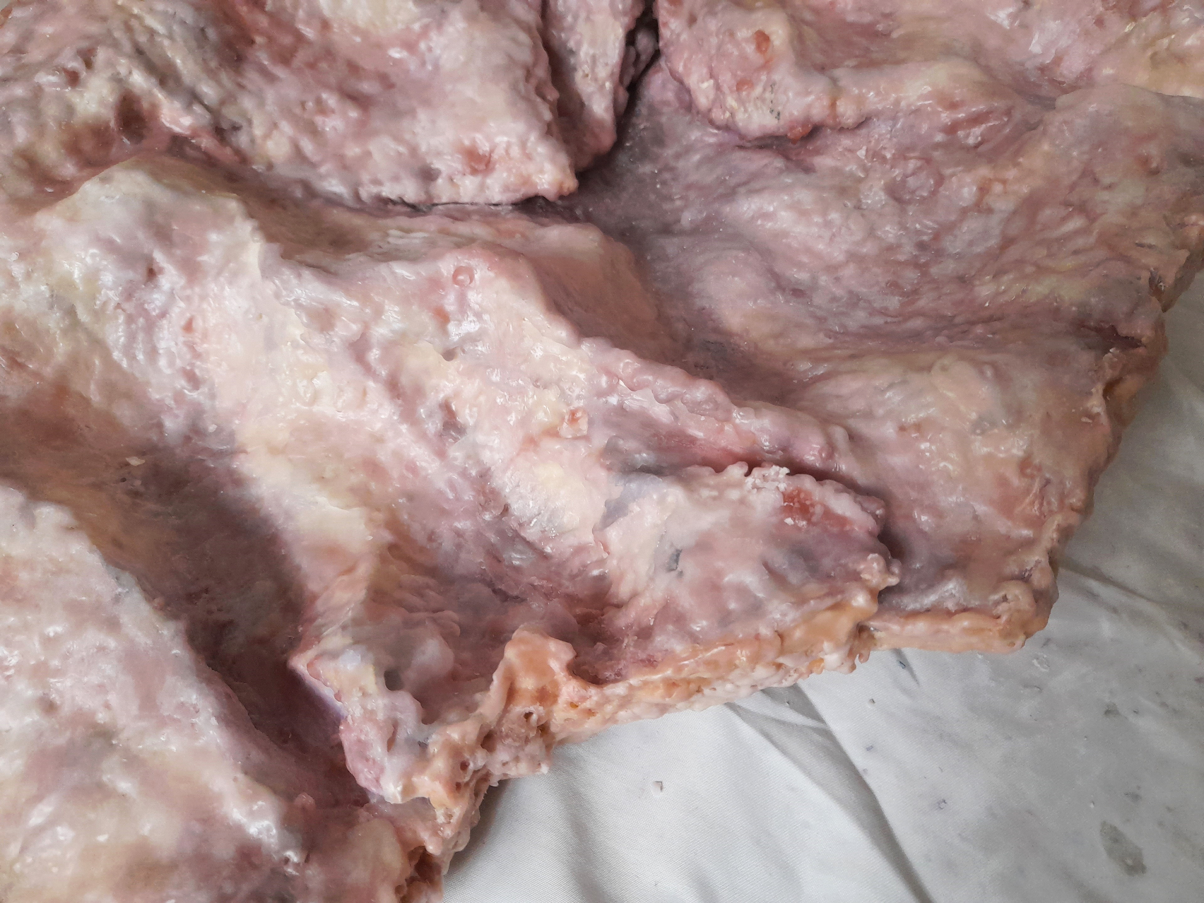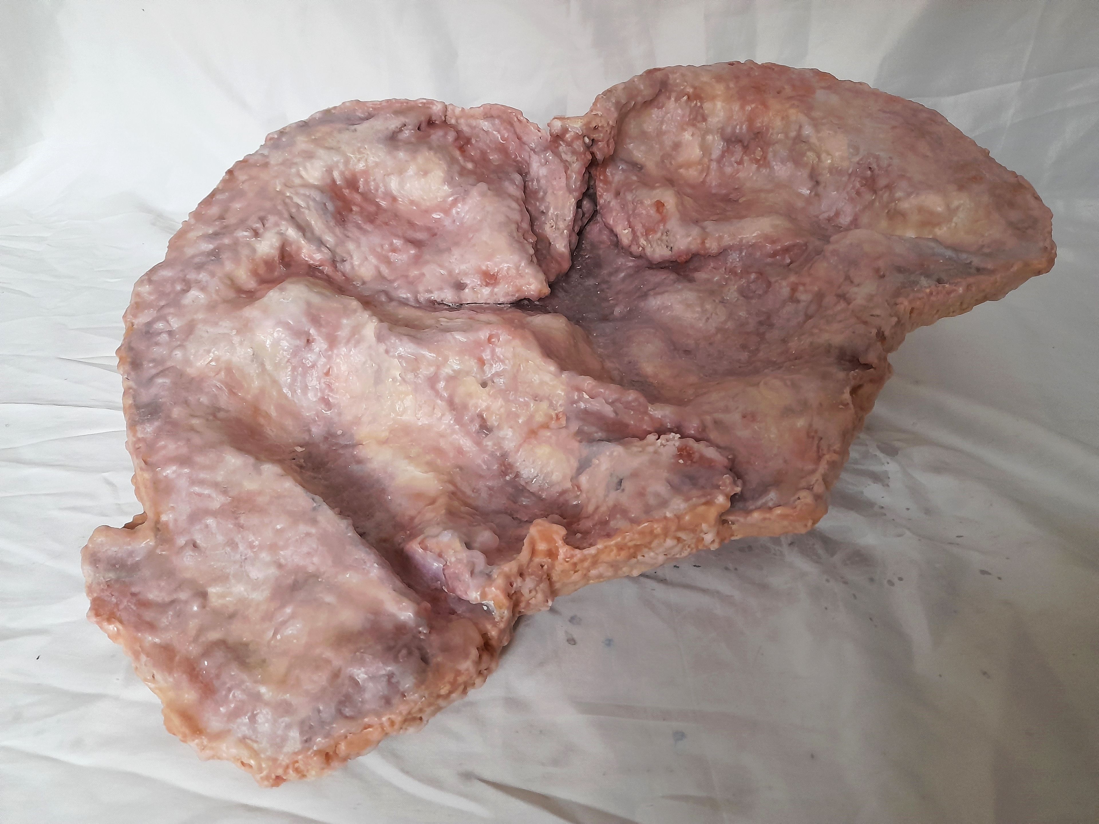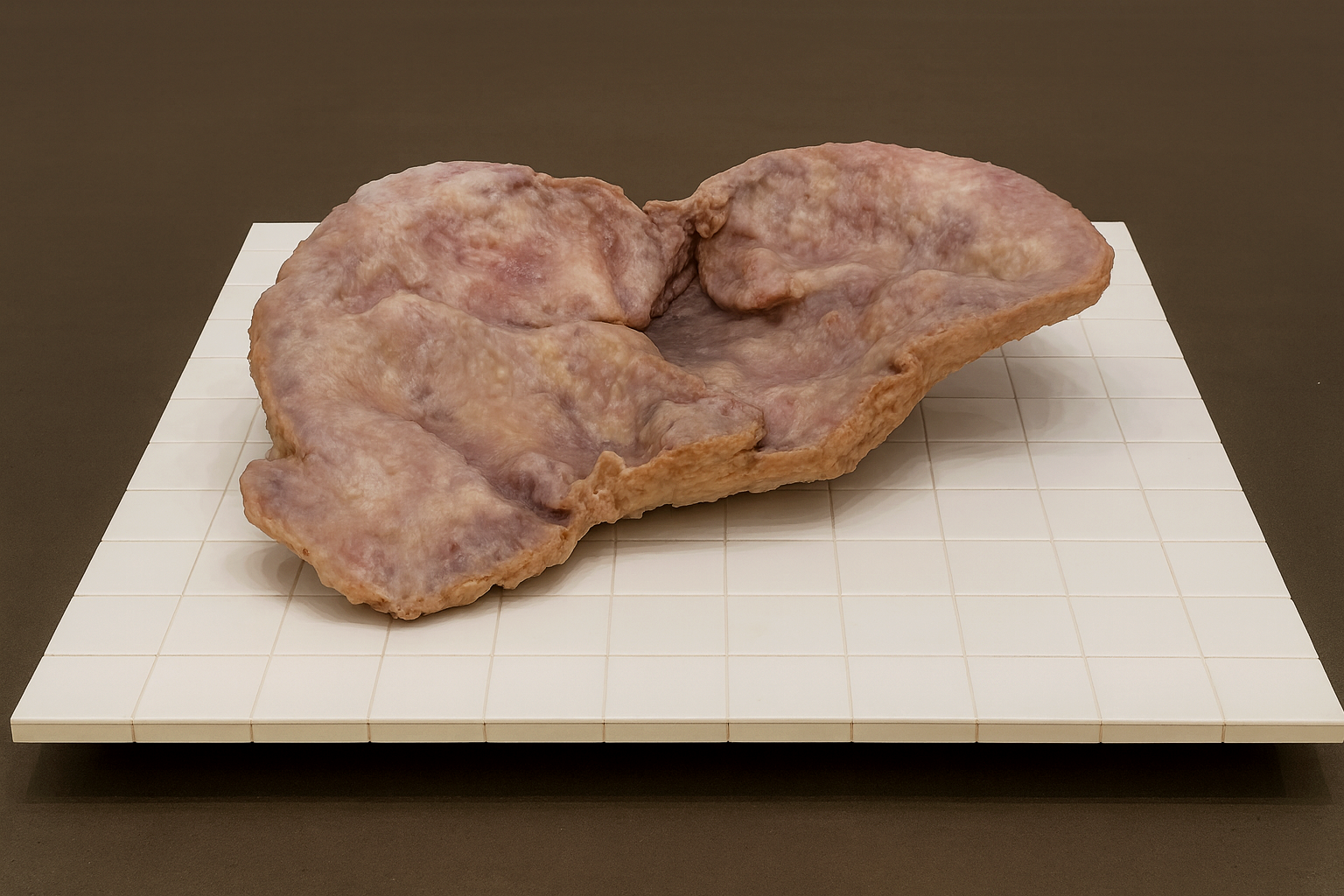 Bu seri, deriyi yalnızca bedeni saran koruyucu bir katman olarak değil, aynı zamanda bedenin sınırlarını belirleyen, ihlal edilebilir bir yüzey olarak ele alır. Lezyon 1, ameliyat sırasında derinin açılması, dikilmesi ve biçim değiştirmesi gibi müdahaleleri ve bu işlemler sonrasında oluşan izleri görünür kılar. Çalışmanın yüzeyi et ya da yara izlerini anımsatan katmanlı ve organik dokulardan oluşur. Parafinin girinti-çıkıntıları ve renk geçişleri, deri altı dokularına benzer bir etki yaratarak bedensel kırılganlığı ve geçirgenliği vurgular. Tanımsız ve biçimsiz bu form, derinin açıldığı ve etin açığa çıktığı aralığı işaret eder; sınırların silindiği, bütünlüğün geçici olarak kaybolduğu bir durumu yansıtır.